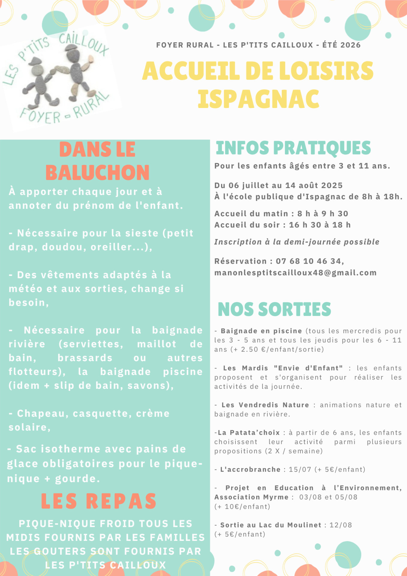 Pour toute nouvelle demande d’inscription, ou pour avoir des renseignements, n’hésitez pas à contacter Manon SCELLIER, directrice de l’ALSH au 07 68 10 46 34 ou à manonlesptitscailloux48@gmail.com